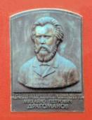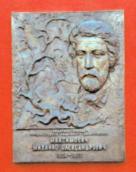 бронзову меморіальну дошку з барельєфним портретом М. Грушевського (1996, ск. І. Макогон, арх. А. Ігнащенко).