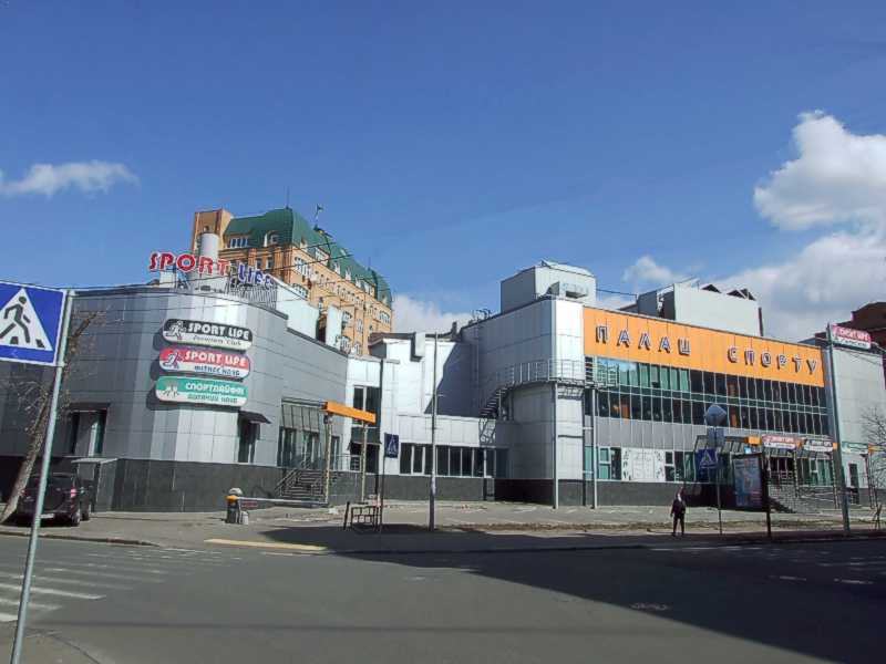 Палац спорту (№ 62)Розмір зображення: 800:600 піксел Вигляд із заходу. Ліворуч – вул. Оболонська, праворуч – вул. Волоська (яка тут закінчується на перетині з Оболонською). Фото М. І. Жарких, 24 березня 2021 р. |