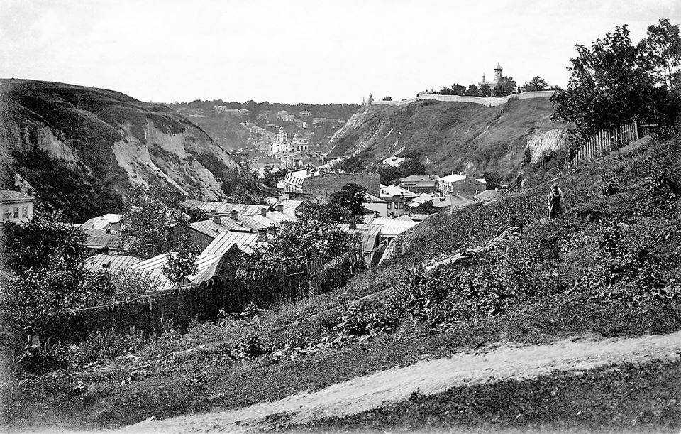 Поч. 20 ст. (?) Перспктива вул. Гончарної – ВоздвиженськоїРозмір зображення: 960:611 піксел Фото опублікував Олег Заварзін 11.10.2019 р. В кінці вулиці – церква Воздвиження. А праворуч, на Замковій горі – церква на цвинтарі (досить рідкісне фото). |