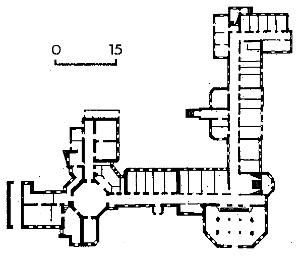 Головний корпус. План 1 поверхуРозмір зображення: 593:507 піксел Джерело: Звід пам’яток історії і культури України. – К.: 1999 р., т. 1 (Київ), с. 517. |