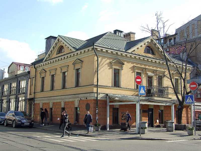 Житловий будинок (№ 16 / Межигірська, 7)Розмір зображення: 800:600 піксел Ліворуч – вул. Межигірська, праворуч – вул. Хорева. Фото М. І. Жарких, 1 квітня 2021 р. 2008 р.: міститься Товариство репресованих. |