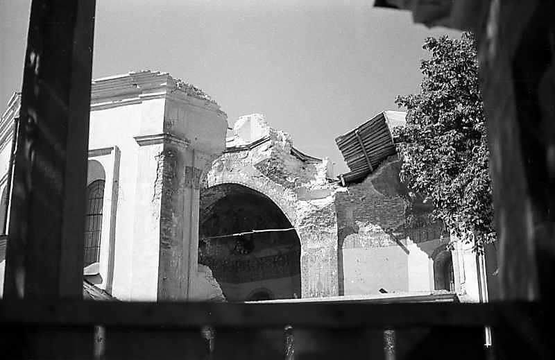 1983 р. Підкупольний простірРозмір зображення: 800:519 піксел Вигляд з південного сходу після обвалу в ході реставрації. 1983 р. Вересень. Фото М.І.Жарких. Негатека, № 259-23. |