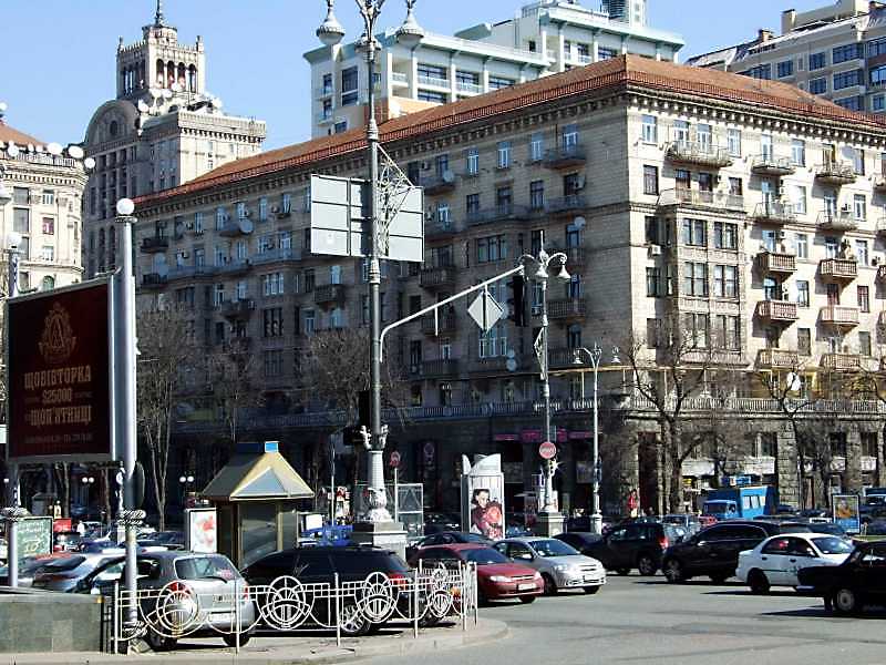2009 р. Загальний вигляд з південного заходуРозмір зображення: 800:600 піксел Ліворуч – Хрещатик, праворуч – Бесарабська площа. 3 квітня 2009 р. Фото М.І.Жарких. |