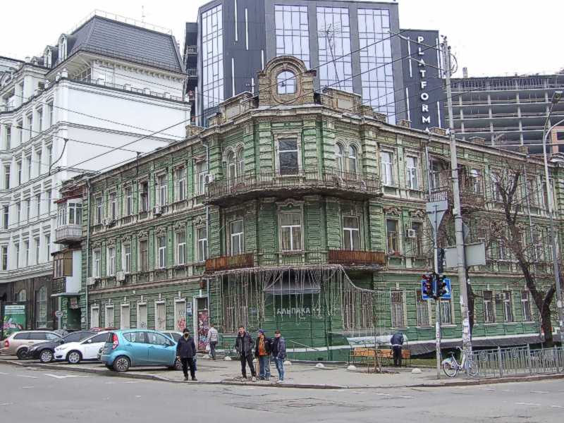 Житловий будинок (№ 43б)Розмір зображення: 800:600 піксел Ліворуч – вул. Жилянська, праворуч – вул. Тарасівська. Фото М. І. Жарких, 31 березня 2021 р. |