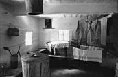 Піч-кам’янка з плетеним комином, стіл з одної колотої дошки, укладеної на закопані в землю сішки. Жорна перед дощаним полом, полиці для мисок, поздовжня колота і тесана соснова лава.