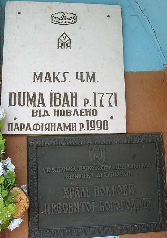 Фото Зенона Боровця і Богдана Тхора, 6 серпня 2010 р. Напис: «Макs ЧМ Duma Іван 1771 відновлено парафіянами 1990». «Українська греко-католицька церква. Львівська архієпархія. Храм Покрови пресвятої богородиці». |