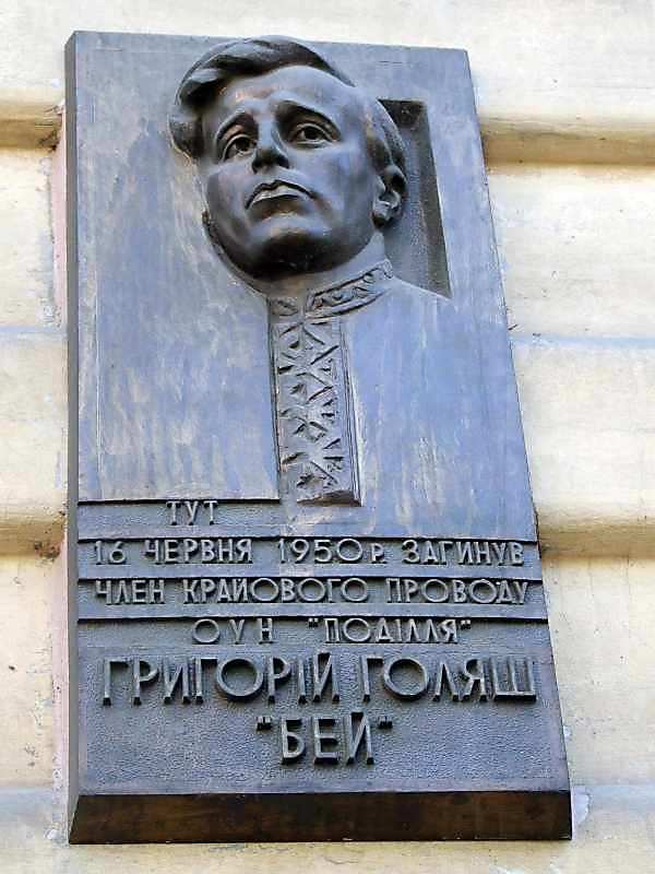На дошці напис: «Тут 16 червня 1950 р. загинув член крайового проводу ОУН «Поділля» Григоій Голяш «Бей».
