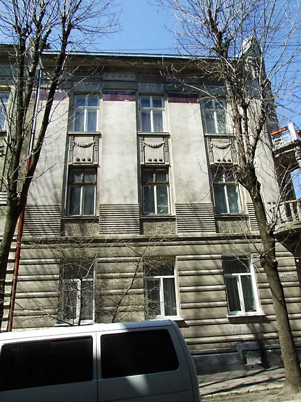 2013 р. Головний фасад Розмір зображення: 600:800 піксел 19 квітня 2013 р. Фото М.І.Жарких. Вкладені елементи Сецесійне вікно 2-го поверху Сецесійний балкон 2-го поверху