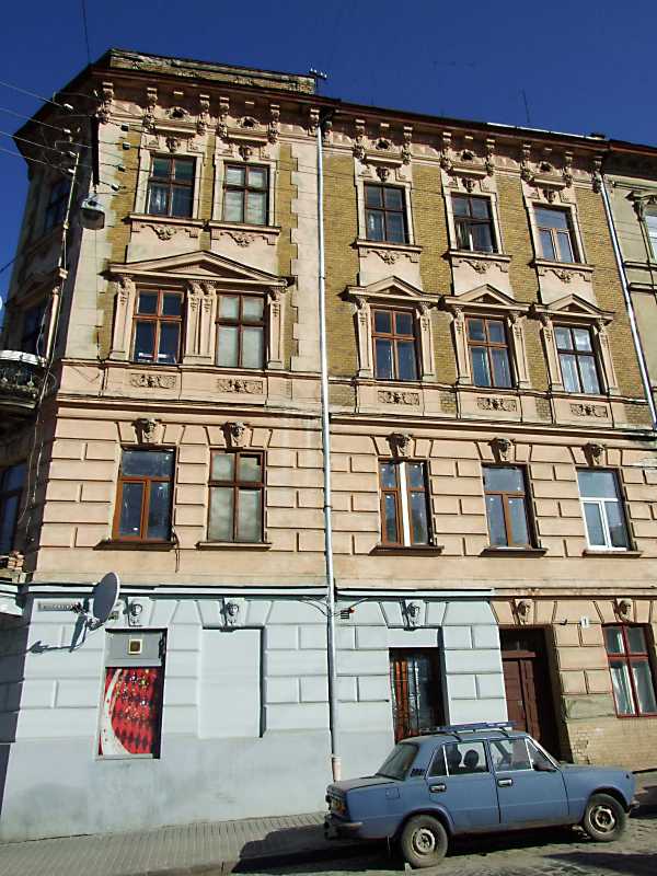 2013 р. Фасад по вул. Солодовій Розмір зображення: 600:800 піксел 18 квітня 2013 р. Фото М.І.Жарких. Вкладені елементи Вікна 4-го поверху Вікна 3-го поверху (+) Вікно 2-го поверху