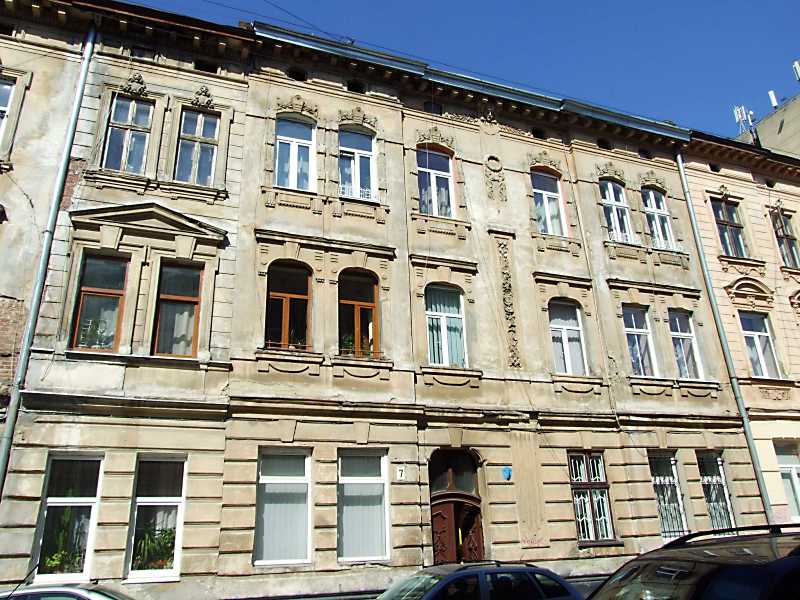 Житловий будинок (№ 7) Розмір зображення: 800:600 піксел 18 квітня 2013 р. Фото М.І.Жарких. Вкладені елементи 2013 р. Фрагмент фасаду у стилі сецесії