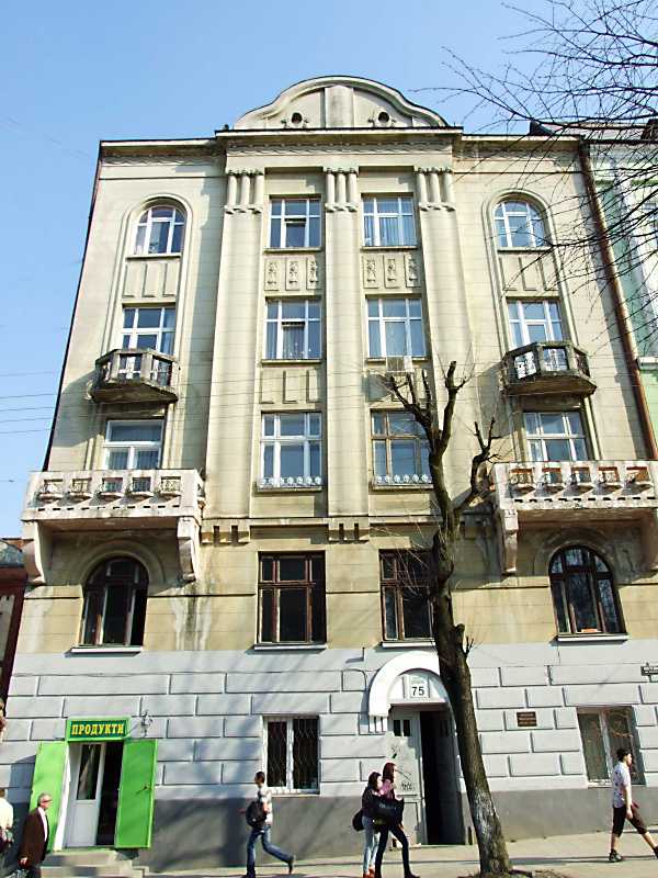 2013 р. Головний фасад Розмір зображення: 600:800 піксел 19 квітня 2013 р. Фото М.І.Жарких. Вкладені елементи Сецесійні рельєфні прикраси