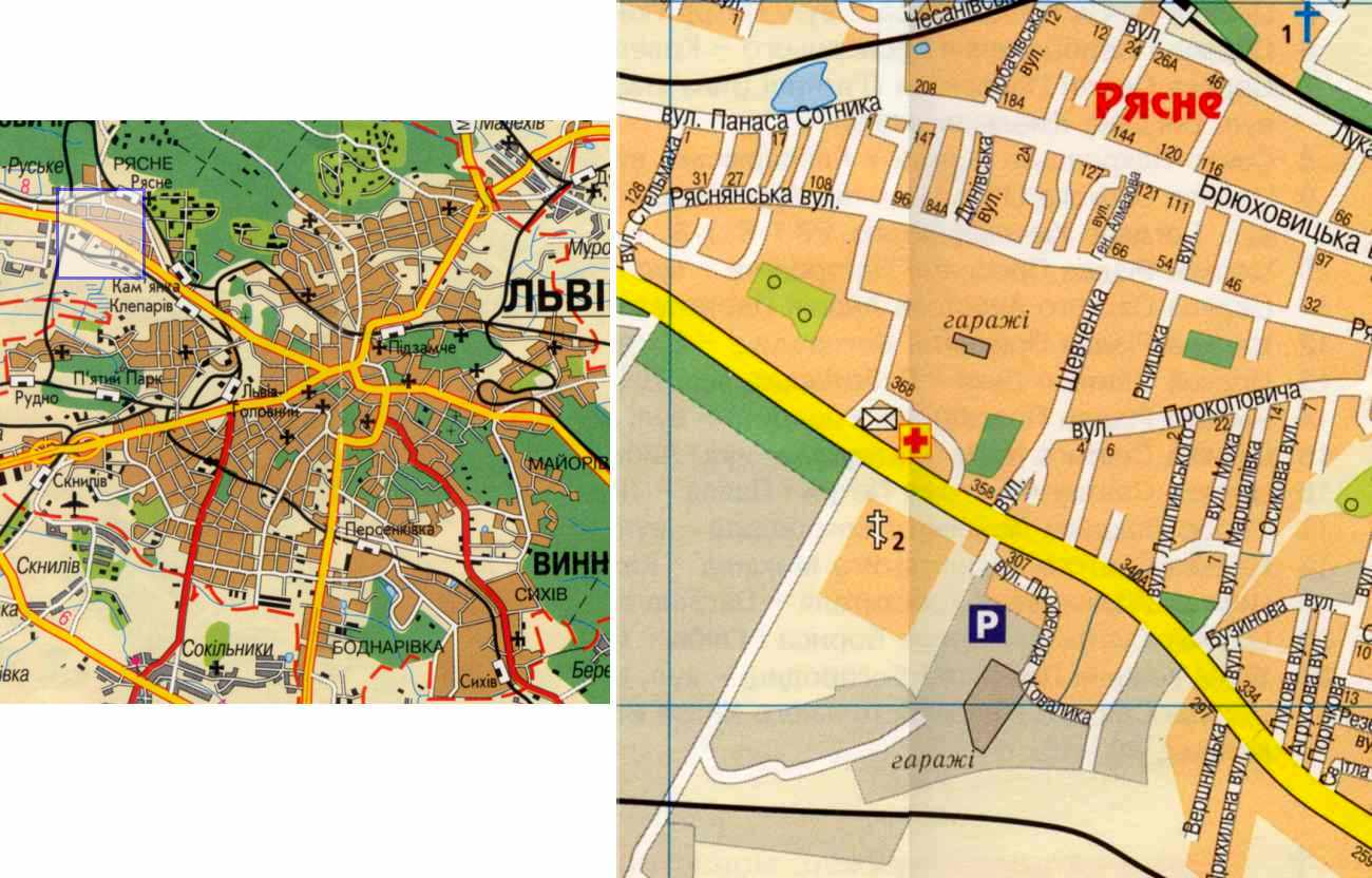 Ситуаційний план (церква позначена білим хрестом – 2)Розмір зображення: 1300:832 піксел Джерело: Карта м.Львова. – К.: 2001 р., 1:20 000. |