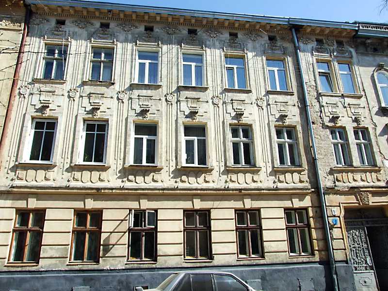 2013 р. Головний фасад Розмір зображення: 800:600 піксел 18 квітня 2013 р. Фото М.І.Жарких. Вкладені елементи Сецесійне вікно 2-го поверху Сецесійний проїзд