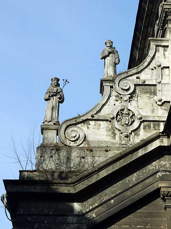 Фрагмент фронтону Розмір зображення: 600:800 піксел 4 квітня 2012 р. Фото М.І.Жарких. Вкладені елементи Ліва постать святого Права постать святого Герб в круглому медальйоні