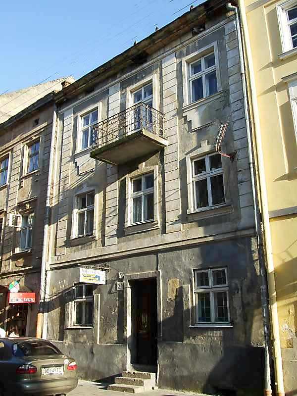 ЖИЛОЙ ДОМ, XVII в. (ул. Фрунзе, 24). Построен по проекту архитекторов А. Прихильного и А. Покоры. Реконструирован в конце XIX в. Кирпичный, вытянутый в плане, трехэтажный. Фасад завершен аттиком и раскрепованным карнизом, расчленен рустованными лопатками. [Памятники градостроительства и архитектуры УССР. – К.: Будівельник, 1985 г., т. 3, с. 72].