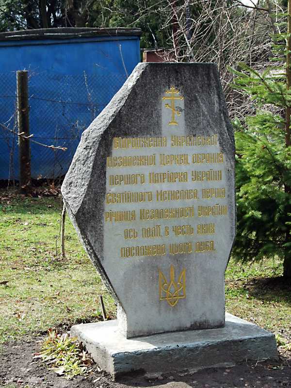 На плиті напис: «Відродження української незалежної церкви, обрання першого патріарха України святійшого Мстислава, перша річниця незалежності України – ось події, в честь яких посаджено цього дуба».