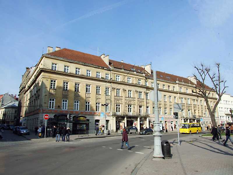 У будинку № 1/3 за польських часів містилося Кредитне товариство землевласників, Товариство польських купців, торгівельно-промисловий заклад оптики та механіки Леона Аппеля, кінотеатр “Палас” (від грудня 1939 року – імені Тараса Шевченка), приміщення якого на подвір’ї було зруйновано під час війни, більше його не відновлювали, фотоательє Sztuka, кондитерська Mascotte, перукарня та магазин парфумів Стоінського, ювелірна крамниця “Бійон”, магазини: зброї Дмитраха, квітів Старки, полотна та білизни Беєра, від повоєнних часів – крамниці “Воєнторг” і “Культтовари” (“Фототовари”), згодом – магазин спорттоварів, який проіснував донині й від часів української незалежності цифровий фотоцентр, магазин “Батарейка”, крамниці мобільного зв’язку “Евросеть” і ювелірних виробів “Перлина”. 1951 року в цьому будинку надбудували четвертий поверх, який повністю відповідав ампірному стилю будівлі.
