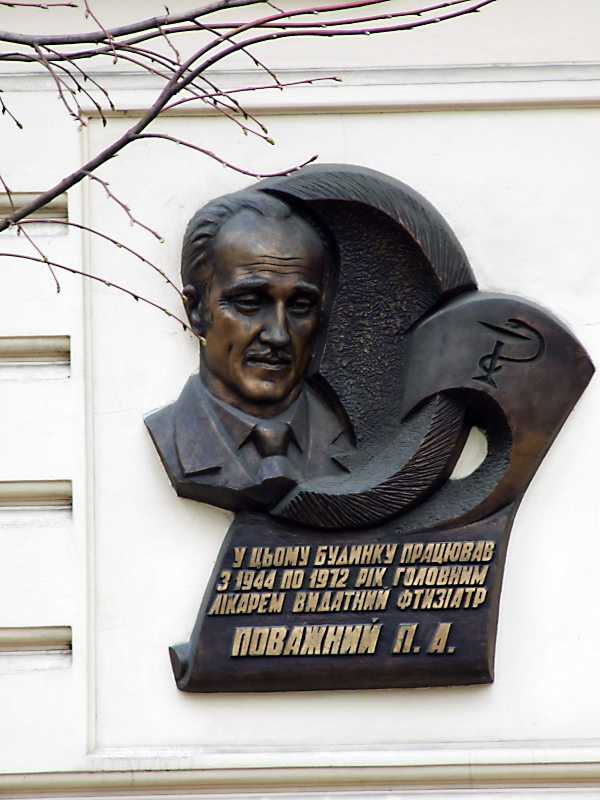 На дошці напис: «У цьому будинку працював з 1944 по 1972 рр. головним лікарем видатний фтизіатр Поважний П. А.»