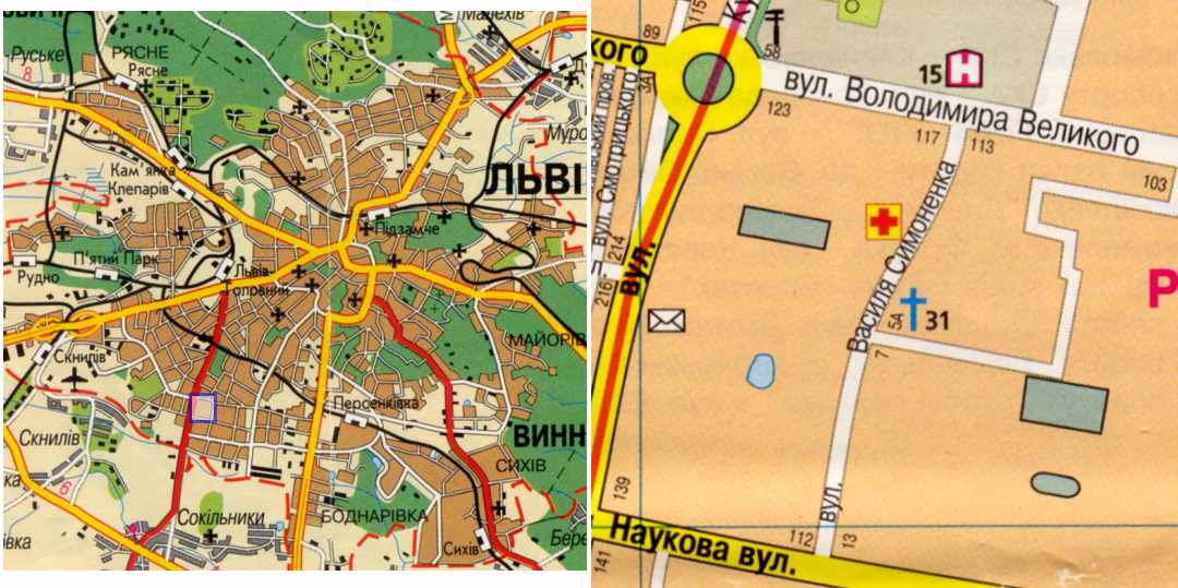 Ситуаційний план (церква позначена синім хрестом – 31)Розмір зображення: 1080:539 піксел Джерело: Карта м.Львова. – К.: 2001 р., 1:20 000. |