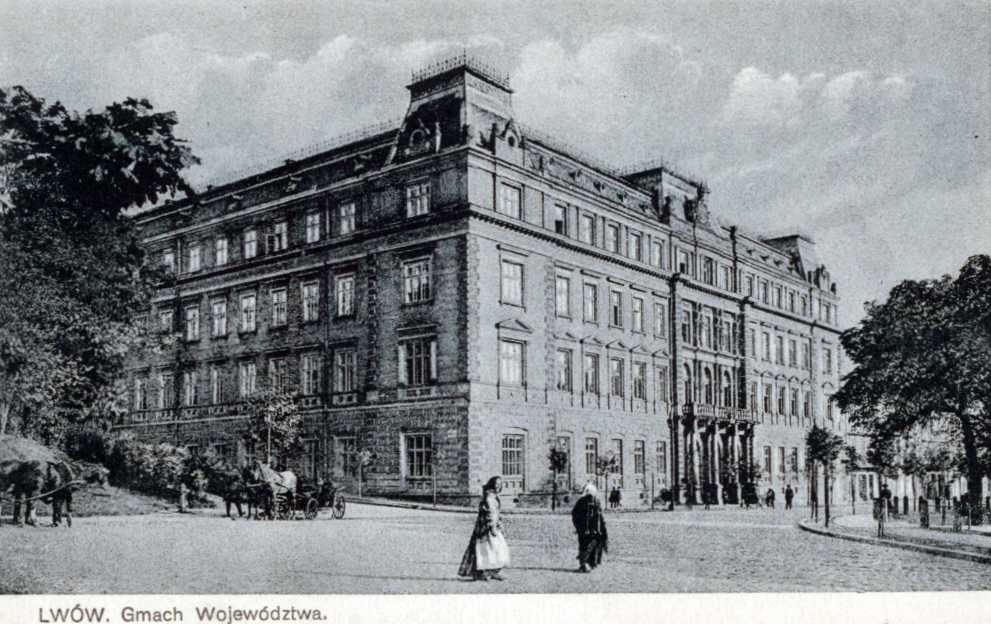 Ще одна подібна поштівка: Lwów, Gmach Województwa = La Voïvodie. [S.l.] : Wyd. Polskiego Towarzystwa Księgarni Kolejowych «Ruch» S. A., [1923-1926] (Kraków : Zakłady Reprodukcyjne «Akropol») (pocztówka) 9 × 14 cm