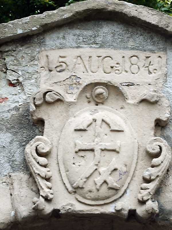 Щит з датою 15.08.1845 р. і гербом Розмір зображення: 600:800 піксел 17 жовтня 2008 р. Фото М.І.Жарких. Попередня сторінка | Вище | Наступна сторінка