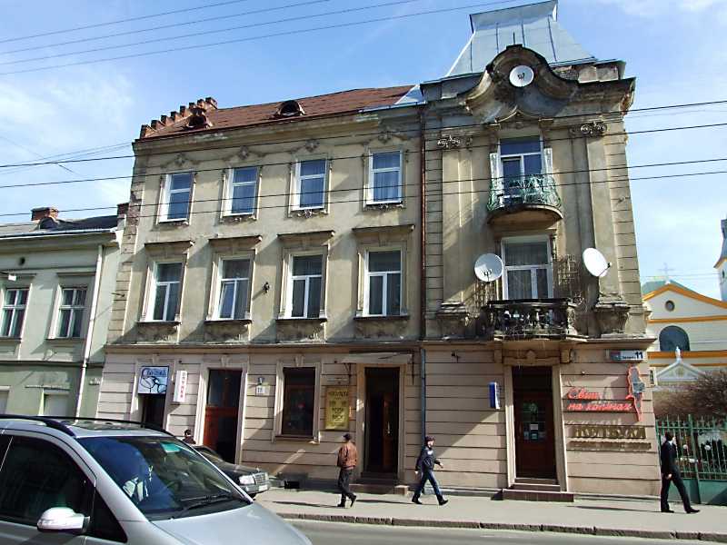 2013 р. Головний фасад Розмір зображення: 800:600 піксел 16 квітня 2013 р. Фото М.І.Жарких. Вкладені елементи Балкон 3-го поверху та фронтон