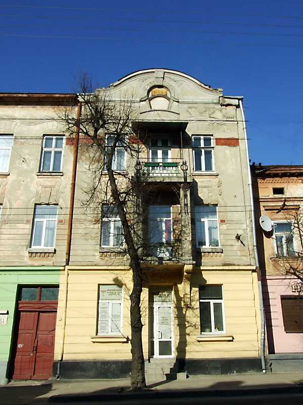 2013 р. Права частина головного фасаду Розмір зображення: 600:800 піксел 18 квітня 2013 р. Фото М.І.Жарких. Вкладені елементи Сецесійний рельєф
