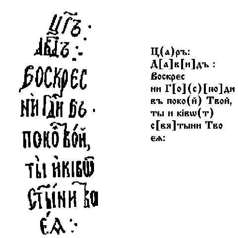 Цар Давид: Воскрес ни Господи в покой Твой, Ти і ківот святині. Твоєя: Цар Давид: Воскресни Господи в спокій свій, Ти й ківот святині. Твоєї. |