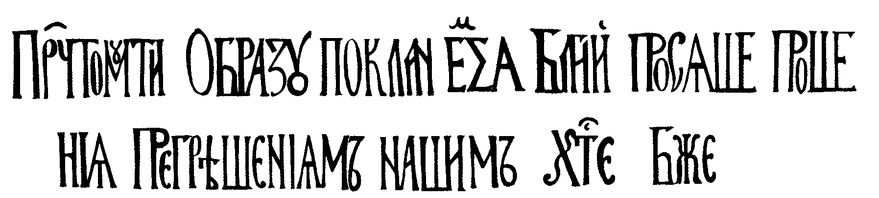 Транскрипція: Пречистому ті Образу покланемся Благий просяще прощенія прегрішеніям нашим Христе Боже