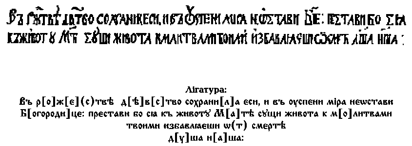 Транскрипція: В рожестві дівство сохранила єси, і в успенії мира не остави Богородице: престави бо ся к животу Маті сущі живота к молитвами твоіми ізбавляєши от смерті душа наша: