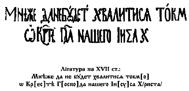Транскрипція: Мні же да не будет хвалитися токмо о Кресті Господа нашего Исуса Христа