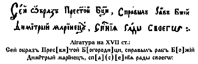 Транскрипція: Сей образ Пресвятой Богородиці, справил раб Божій Димітрий марінець, спасенія ради своего: