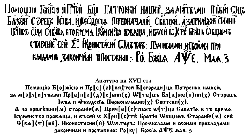 Помощію Божією і Пресвятой Богородиці Патронки нашей, за молитвами Преподобних Отец Блаженних Старец Іова і Феодосія Первоначалних Скитских. А за приліжним старанієм Пречестнаго отца Саватія в то время Ігуменство правяща, і всей о Христі Братіі Общим Старанієм сей Святий. Іконостасний Олтар: Промислами і своїми прикладами закончили і поставили: Року Божія 1705 мая 5