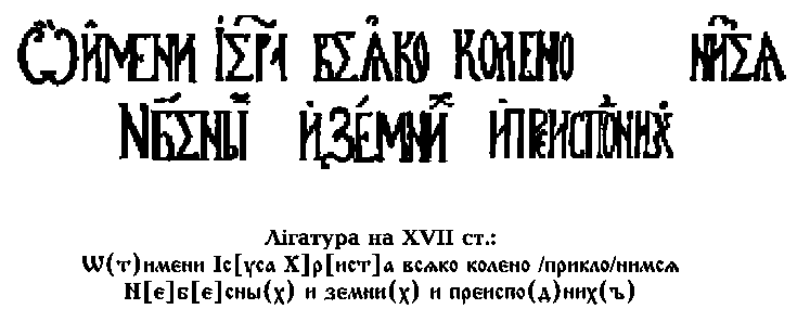 Транскрипція: От імені Ісуса Христа всяко колено приклонимся Небесних і земних і преісподніх