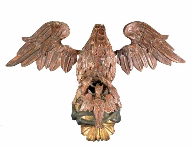 Значні сколи деревини на крилах, зрізи та механічні втрати вздовж волокон деревини. З лицевого боку ліворуч – значне розтріскування деревини, близько 2 мм. Тріщини деревини внизу біля тибля та на терновому вінку. Втрачена частина крила ліворуч та частина дзьоба маленького пелікана. Сліди життєдіяльності жу-ка-деревогриза. Кракелюр левкасу дрібно-сітчастий з втратами по тріщинах. Невеликі відшарування левкасу від основи. Значне окислення посріблення, потертя позолочення та зеленої фарби. Лущення, потертя, подряпини та потемніння лакової плівки, що нерівномірно нанесена. Значні забруднення по всій поверхні та в заглибинах різьби.