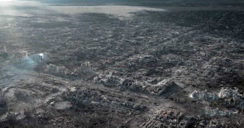 2023 р. АерофотоРозмір зображення: 840:441 піксел «Русский мир» повністю зруйнував Мар’їнку. Фото з телеграм-каналу Андрія Єрмака, опубліковане 5.03.2023 р. |