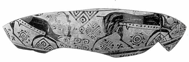 Фрагмент посудиниРозмір зображення: 800:264 піксел Фрагмент посудини з зображенням козлів з Березані. Родос. VII ст. до н.е. Глина. Висота 8 см. Одеський археологічний музей АН УРСР. Джерело: Античне мистецтво. – К.: Мистецтво, 1977 р., № 3. |