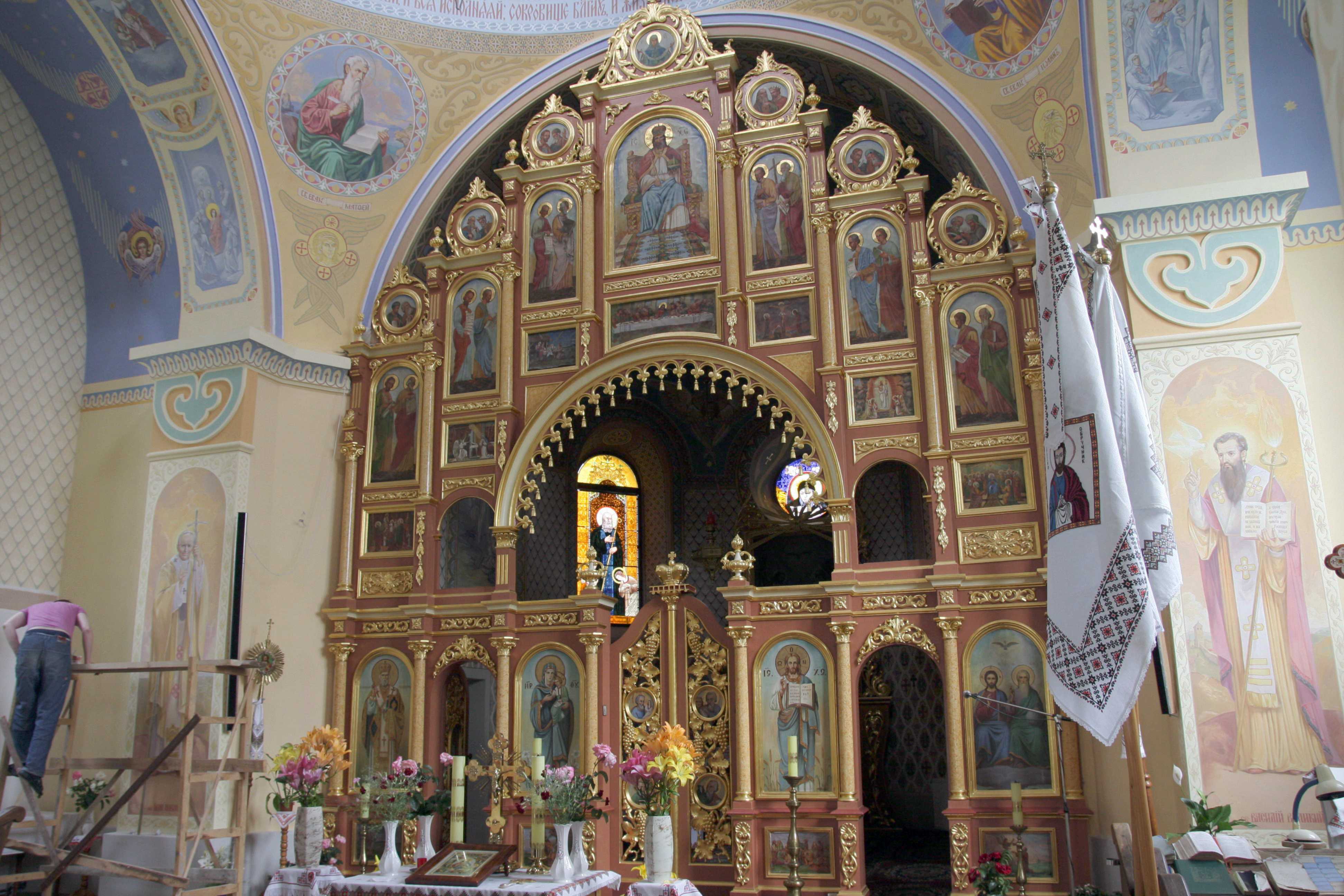 Іконостас. Вигляд з правого бокуРозмір зображення: 3888:2592 піксел Фото Зенона Боровця і Богдана Тхора, 9 липня 2014 р. |