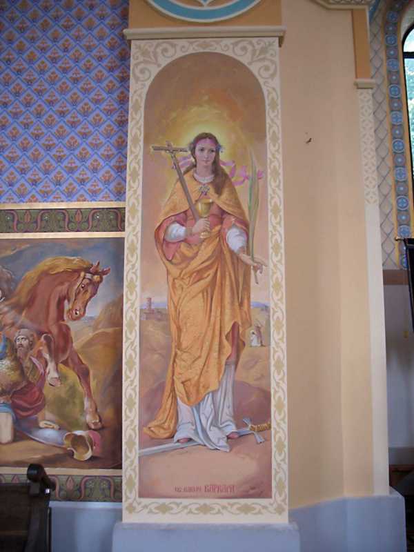Стінопис «Св. Варвара»Розмір зображення: 600:800 піксел Стінопис підкупольного стовпа. Фото Зенона Боровця і Богдана Тхора, 9 липня 2014 р. |
