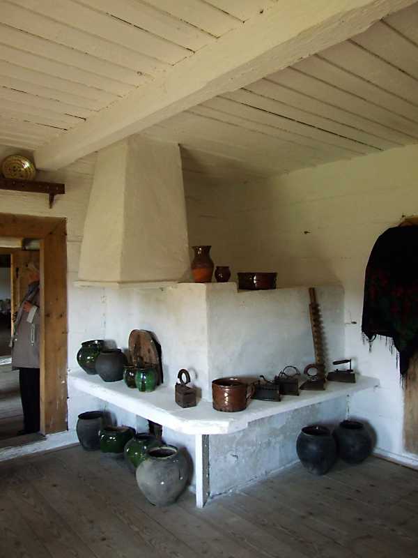 На припічку бачимо цілу колекцію з п’яти чавунних прасок, між ними – рубель.