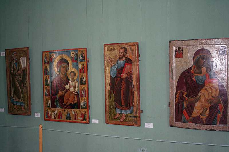 Фрагмент експозиції іконРозмір зображення: 800:533 піксел Фото Зенона Боровця і Богдана Тхора, 13 серпня 2009 р. Від лівого краю: апостол Петро, Богородиця провідниця, апостол Павло, Богородиця замилування. |