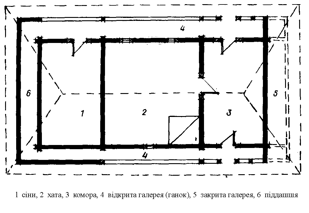 l – сіни, 2 – хата, 3 – комора, 4 – відкрита галерея (ганок), 5 – закрита галерея, 6 – піддашшя.