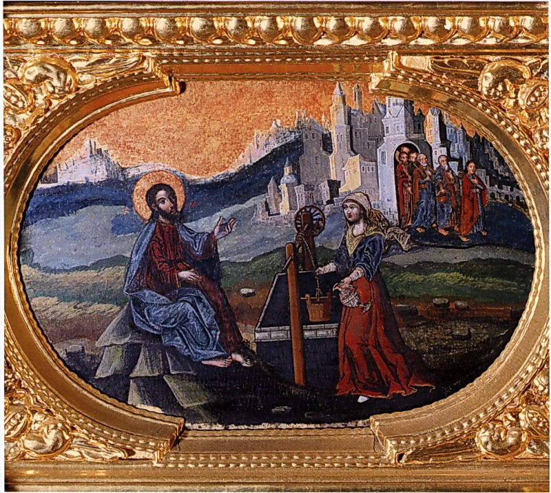 Христос і самаритянка, 4 чв.17 ст. Розмір зображення: 800:716 піксел Христос і самаритянка. Ікона 4 чв. 17 ст. Вкладені елементи Христос Самаритянка Апостоли