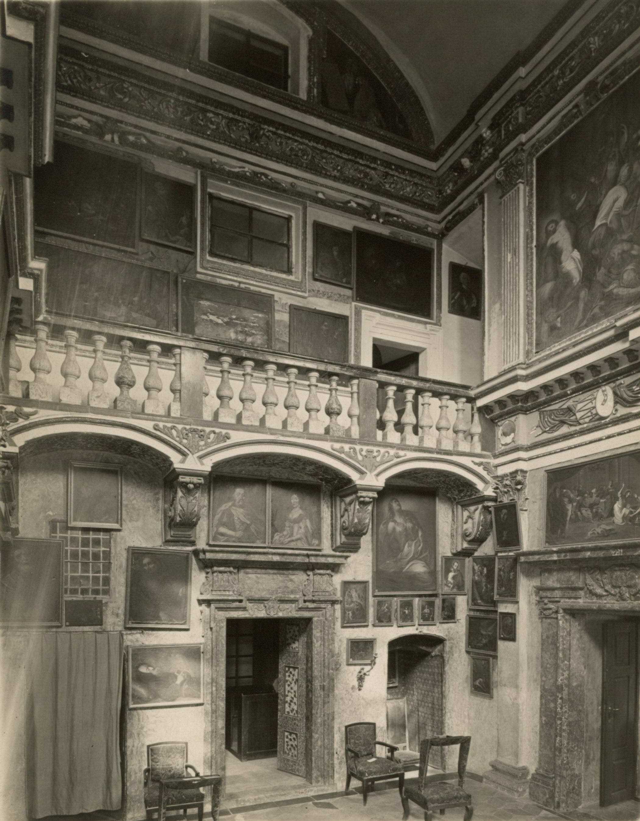 1909 р. Каплиця. Північна стіна зі входом і хорамиРозмір зображення: 2101:2694 піксел Зі статті Володимира Прокопова «Інтер’єр, який ви ніколи не побачите. Унікальні фотографії залів Підгорецького замку» (1 червня 2017 р.) |