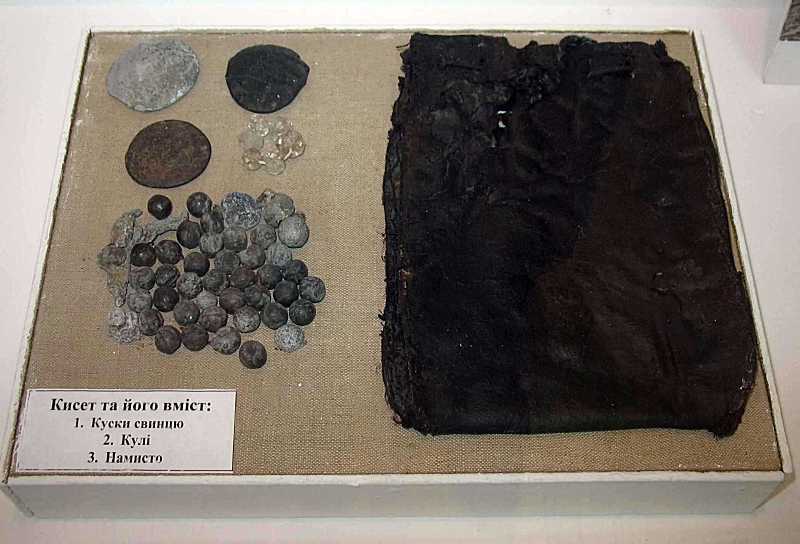 Кисет з кулямиРозмір зображення: 800:544 піксел Кисет (праворуч) та його вміст; куски свинцю, намисто, кулі. Фото Зенона Боровця, 6 липня 2007 р. |