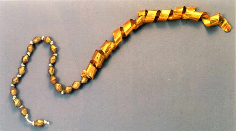 Золото. Довжина стрічки 30 см, діаметр 1.5 – 1.6 см; діаметр кульок 1.6 – 1.7 см.