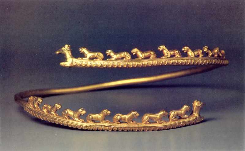 Гривна з двома групами фігур левів та завершеннями у формі передніх частин оленів.