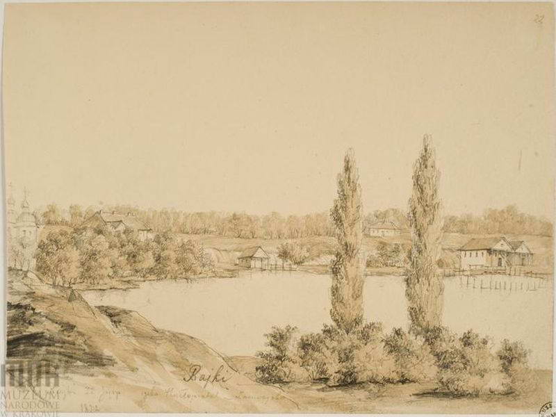 Widok ogólny od strony rzeki Hniłopiaty. 1872. Dat.: Rafki 22 Sierp. 1872. Napis: Rajki – rzeka Hniłopiata -Zamczysko; napis na podkładzie: Wołyń Rajki—wieś. Rys. ołówkiem podmalowany sepią, 18,4x24,4. lll-r.a. 4237 (Teka Wołyń). [Katalog rysunków architektonicznych ze zbiorów Muzeum narodowego w Krakowie. 1. Rysunki Napoleona Ordy / Opracowały Zofia Kucielska i Zofia Tobiaszowa. – Warszawa: Państwowe wydawnictwo naukowe, 1975, Nr. 589]