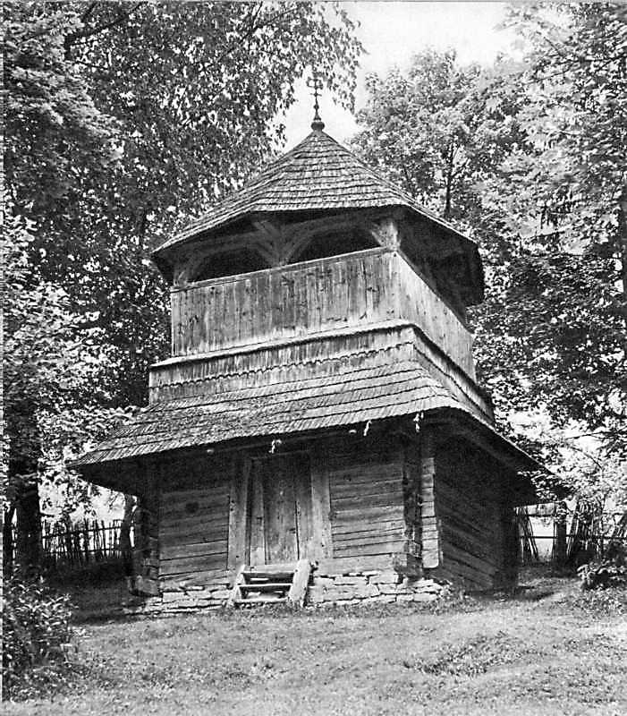 [1970 р.] Дзвіниця. Загальний виглядРозмір зображення: 701:800 піксел Джерело: Гоберман Д. Н. Памятники деревянного зодчества Закарпатья. – Ленинград: Аврора, 1970 г. |