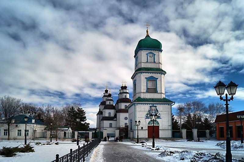 КОЛОКОЛЬНЯ, XIX в. Расположена к западу от собора. Деревянная, квадратная в плане, трехъярусная, с постепенным уменьшением площади ярусов, завершена граненым куполом. Во втором ярусе прорезаны окна-голосники, в третьем – установлены часы. Колокольня, тяжелая по пропорциям с сухими архитектурными формами, стилистично не связана с барочной и динамичной архитектурой девятиглавого собора. К колокольне примыкает ограда территории собора.
